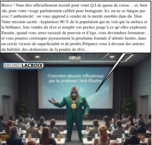 Je ferais bien une formation sur l’aspect biochimique et physiologique du type de Professeur Nick Elautre..ps : attention uniquement lorsque le produit n’est pas à la hauteur du marketing, ne pas tout mélanger.